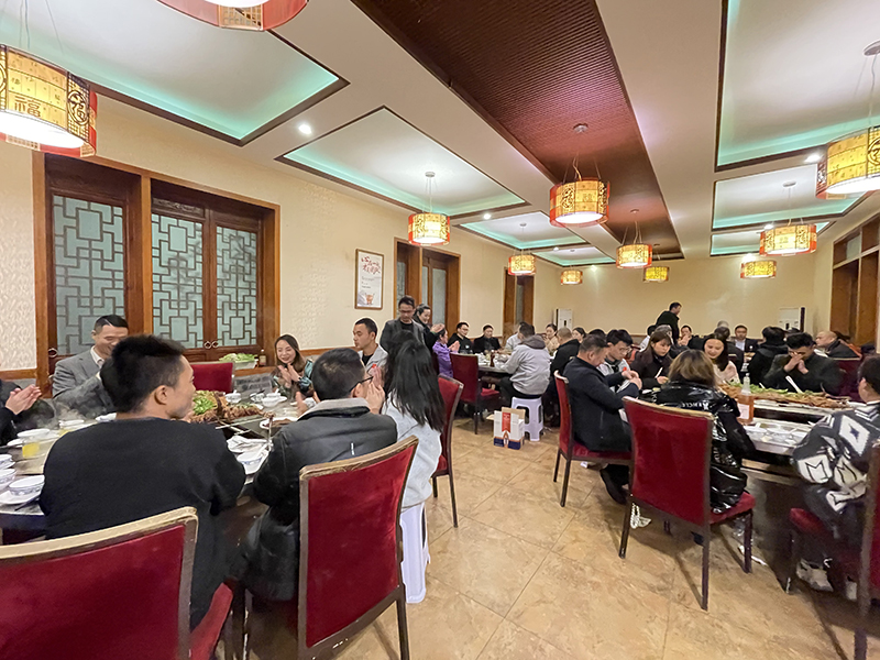 全體員工起立肩并肩,一起唱響“只要我們一起努力,相信我們一定會創(chuàng)造奇跡”,字里行間都激勵著在場每一位員工一定要奮勇前進(jìn),歌聲嘹亮,振奮人心! 伴隨時間的推移,也逐漸拉開了會議的下半場,冬天里的第一只羊。公司用最貼心的方式向每一位員工表達(dá)著自己的愛,讓大家在寒冷的冬天,不再畏懼寒冷,將暖暖的祝福,送到了大家的眼前,融化在火熱的烤羊里。香味四溢的正宗的草原風(fēng)味烤全羊,經(jīng)過專業(yè)師傅的精心烤制,油汁慢慢的從金黃的羊肉中沁出,羊肉也因?yàn)榛鸬闹丝径兊慕瘘S,香氣四溢,讓大家一同體驗(yàn)了大口吃肉大口喝酒的豪放之情,讓大家感受到舌尖上的美食、味蕾的跳動,并訴說著從舌尖到心尖的蛻變,從走胃到走心的真情交流;大家圍坐在一起大快朵頤,席間談笑風(fēng)生,盡展妙趣,共同舉杯歡慶這美好時刻! 有一種浪漫叫并肩作戰(zhàn),有一種力量叫全力以赴,有一種果敢叫奮不顧身。無論前方等待著什么,我們?nèi)耘f拼搏向上,拿出我們最佳的狀態(tài),永遠(yuǎn)堅定地向目標(biāo)邁進(jìn),相信所有堅韌不拔的努力,都會得到勝利的回饋!加油!