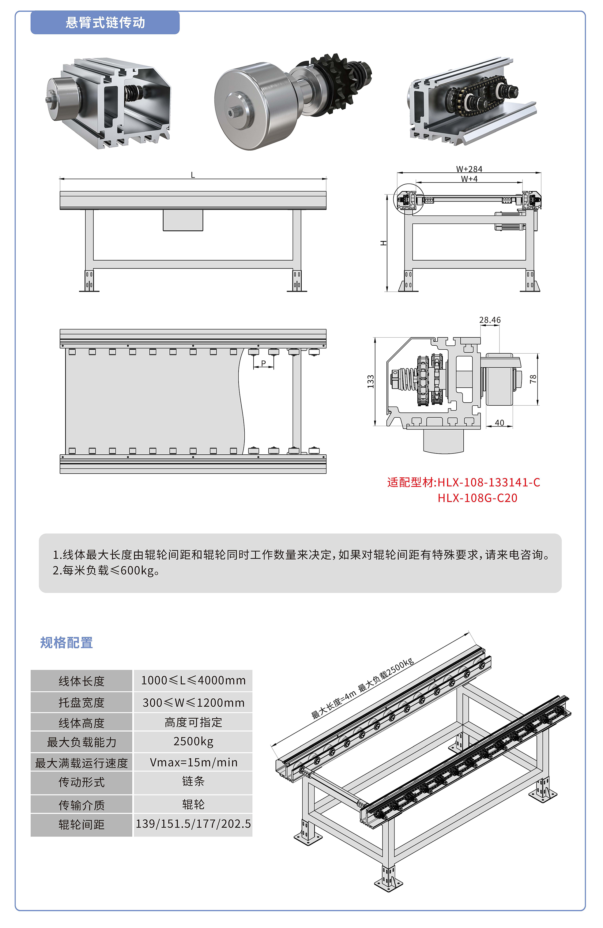 采用133141鋁型材,鏈輪傳動(dòng),鍍鉻滾輪鑲嵌銅套實(shí)現(xiàn)積放功能,負(fù)載2500kg/米,最大負(fù)載速度15M/min, 輪距139、151.5、177、202.5可選,適用托盤寬度300-1200mm,線體長度范圍1000-4000mm, 高度根據(jù)需求定制.