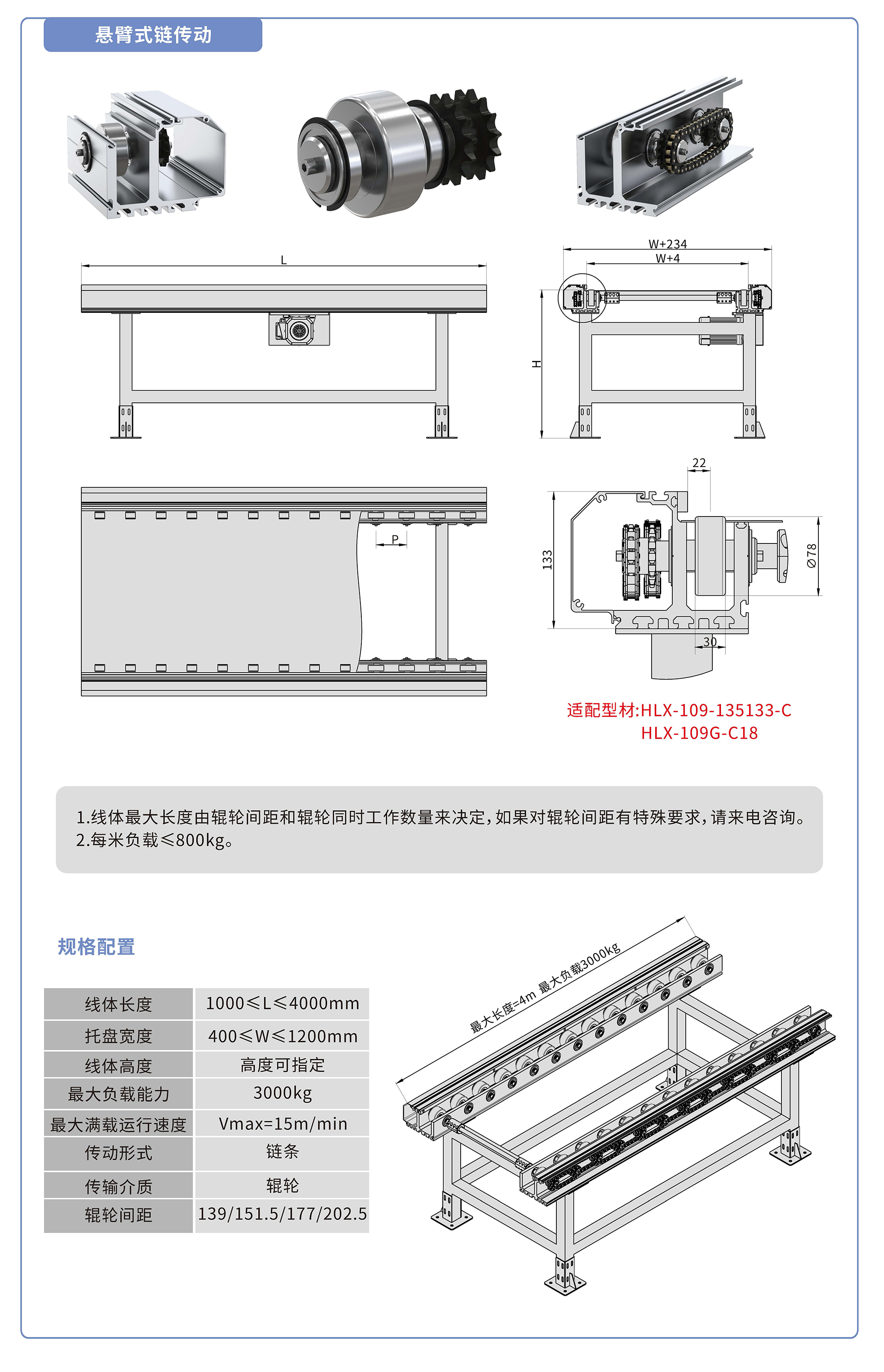 采用135133鋁型材,鏈輪傳動,鍍鉻滾輪鑲嵌銅套實現積放功能,負載3000kg/米,最大負載速度15M/min, 輪距139、151.5、177、202.5可選,適用托盤寬度400-1200mm,線體長度范圍1000-4000mm, 高度根據需求定制.
